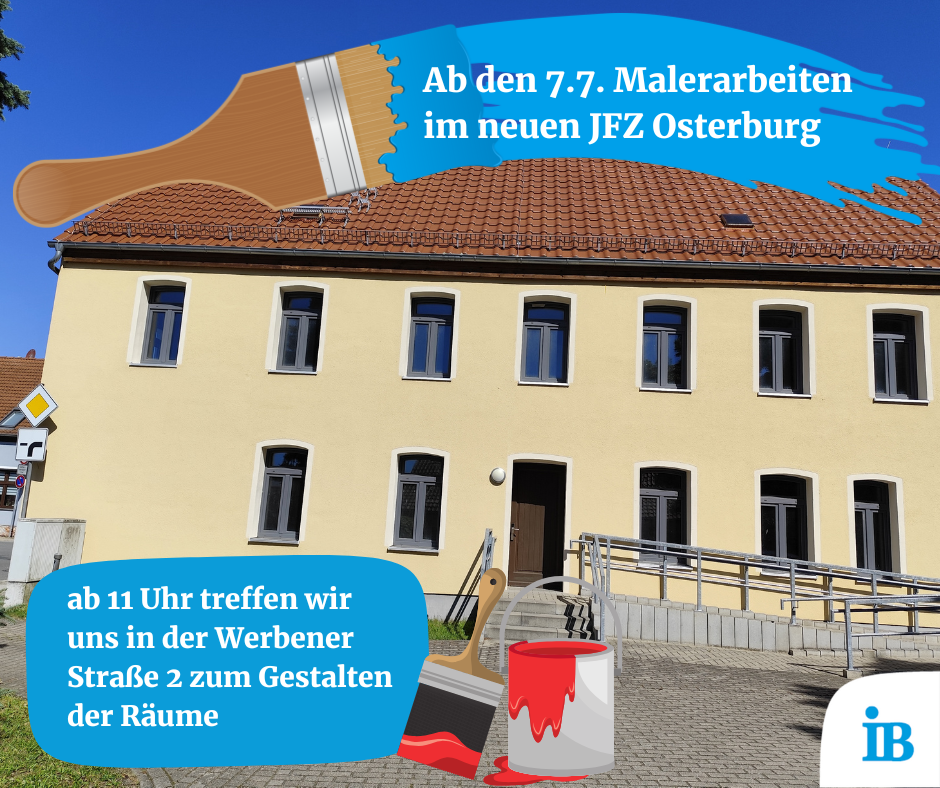 Ab Montag, den 7. Juli 2025, laden die Mitarbeitenden des Jugendfreizeitzentrum (JFZ) alle interessierten Kinder und Jugendlichen herzlich ein, die neuen Räumlichkeiten farblich mitzugestalten. Treffpunkt: am neuen JFZ, Werbener Straße 2 / Ecke Gartenstraße, Uhrzeit: ab 11 Uhr. Gemeinsam wird gepinselt, gestrichen und kreativ gestaltet. Eine erste Gelegenheit, die neuen Räumlichkeiten kennenzulernen, aktiv mitzugestalten und zu einem Ort zu machen, der zu euch als Jugend in Osterburg passt.