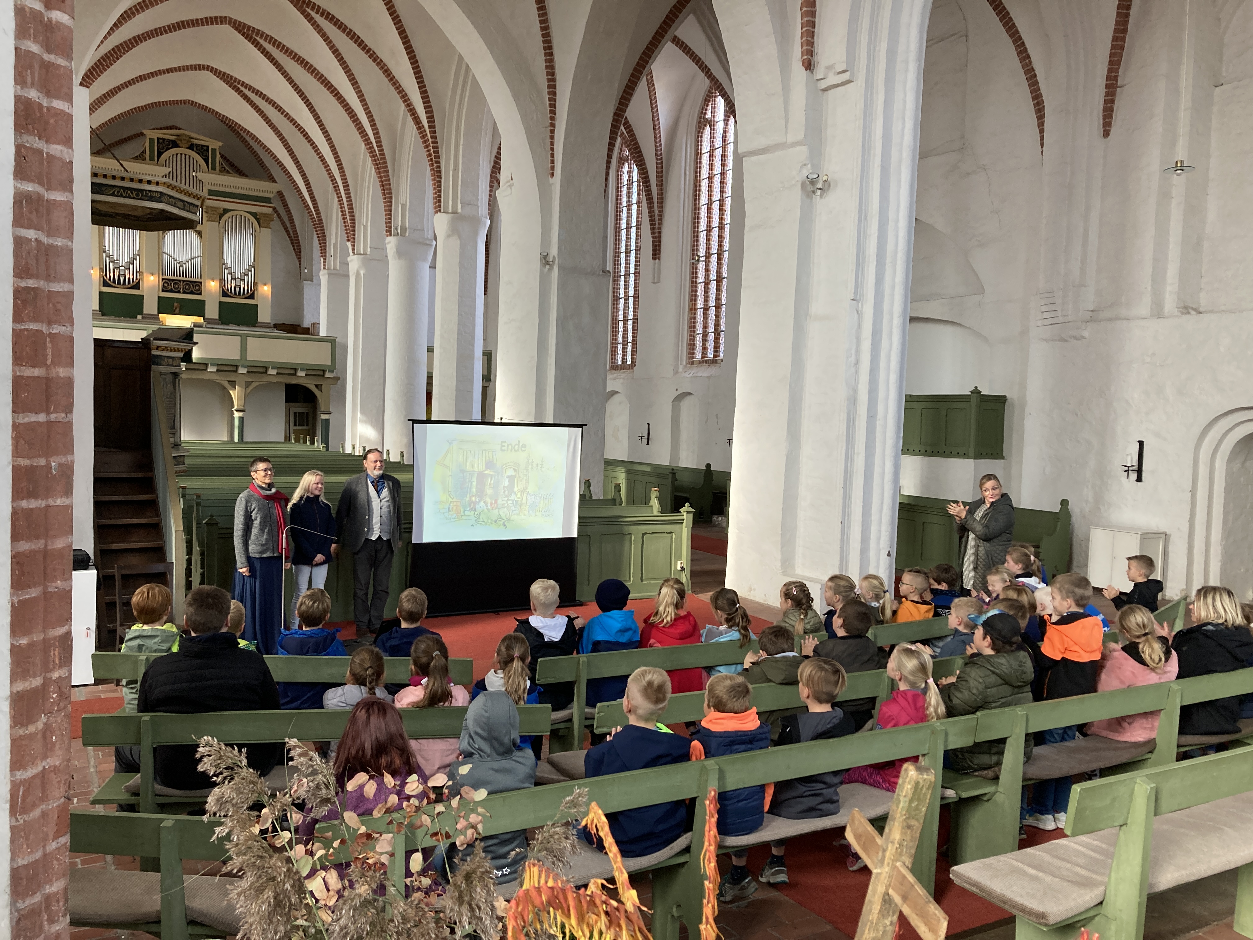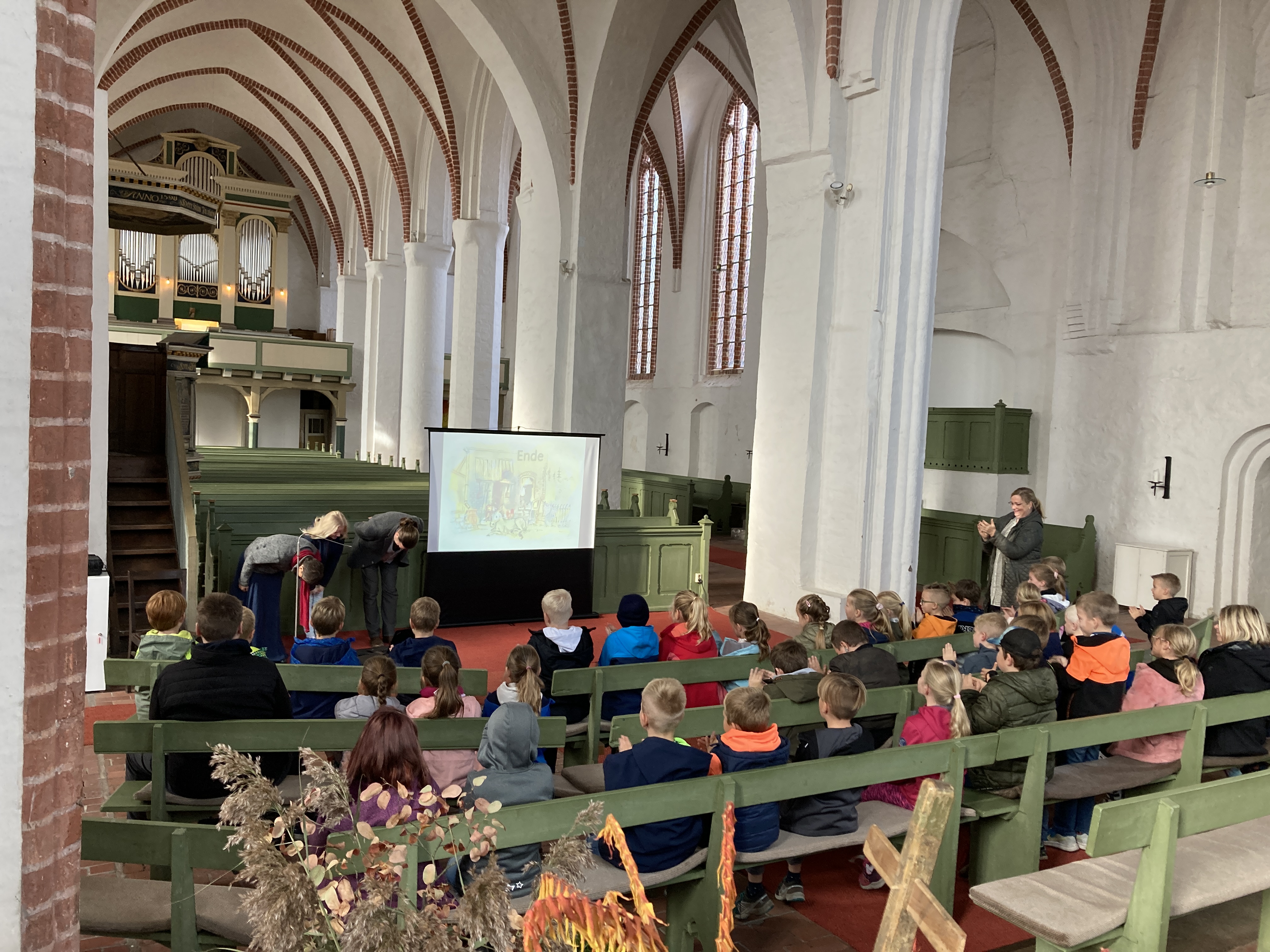 „Oha….“, schubst Finn beim Betreten der evangelischen Kirche St. Nicolai am Montag, den 17. Oktober 2022 seinen Nebenmann leicht an. Der Kopf im Nacken; der Blick Richtung Decke des über 800 Jahre alten Gemäuers. „Bestimmt 100 Meter hoch. Quatsch 1000.“, mutmaßen die beiden Zweitklässler an der Grundschule „Am Hain“ und nehmen vor dem Altar Platz – gemeinsam mit rund 40 weiteren Jungen und Mädchen, die am Vormittag dem Orgelmärchen „Die Bremer Stadtmusikanten“ lauschen wollen. Wie anderthalb Stunden zuvor schon die Erstklässer.