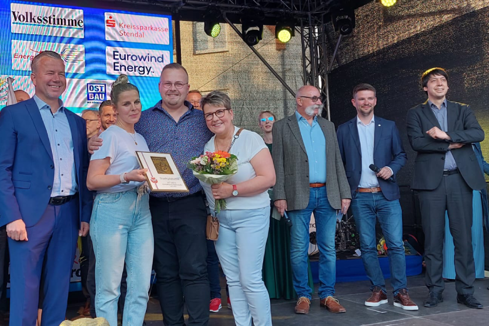Die „Konditorei Behrends“ (seit 2020 „Verzuckert OGH“) ist mit 167 Jahren als das älteste Unternehmen in der Biesestadt. „Die Familie Behrends hat wirtschaftlich wie gesellschaftlich schwere, unsichere Zeiten überstanden – mit zwei Weltkriegen. Aber auch die DDR und hat sich dann unter neuen Marktbedingungen behauptet“, unterstrich Nico Schulz. Eine Zeit nicht nur „zum Zuckerschlecken“, doch mit Fleiß, Mut, Ausdauer, Zusammenhalt und natürlich Handwerkskunst sei es dem für seine Nusstörtchen weit über Osterburg hinaus bekannten Traditionsunternehmen gelungen, noch da zu sein – dankte er nicht nur der jüngsten Generation Behrends, den Geschwistern und Konditormeistern Johanna und Konrad, die sich mit neuen Konzepten und Standorten (Geschäft in der Einkaufsstraße Osterburg, Filialen in Berlin und Stendal) fit für die Zukunft machen. Mutter Manuela Behrends, geb. Schulz, gab den beiden gemeinsam mit dem 2017 verstorbenen Vater Hans Heinrich stets Rückendeckung und Halt auf ihren Wegen. Mit viel Applaus nahm die Familie die Osterburger Stadtplakette in Gold auf der Radio-Brocken-Bühne entgegen.