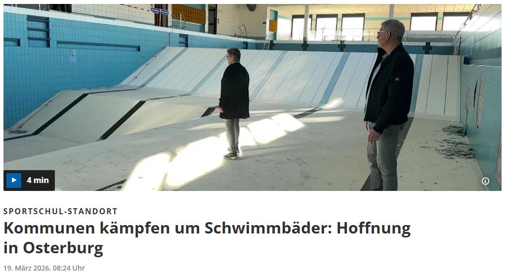 In einem Beitrag des MDR vom 19.03.2026 geht es um "Kommunen kämpfen um Schwimmbäder: Hoffnung in Osterburg".