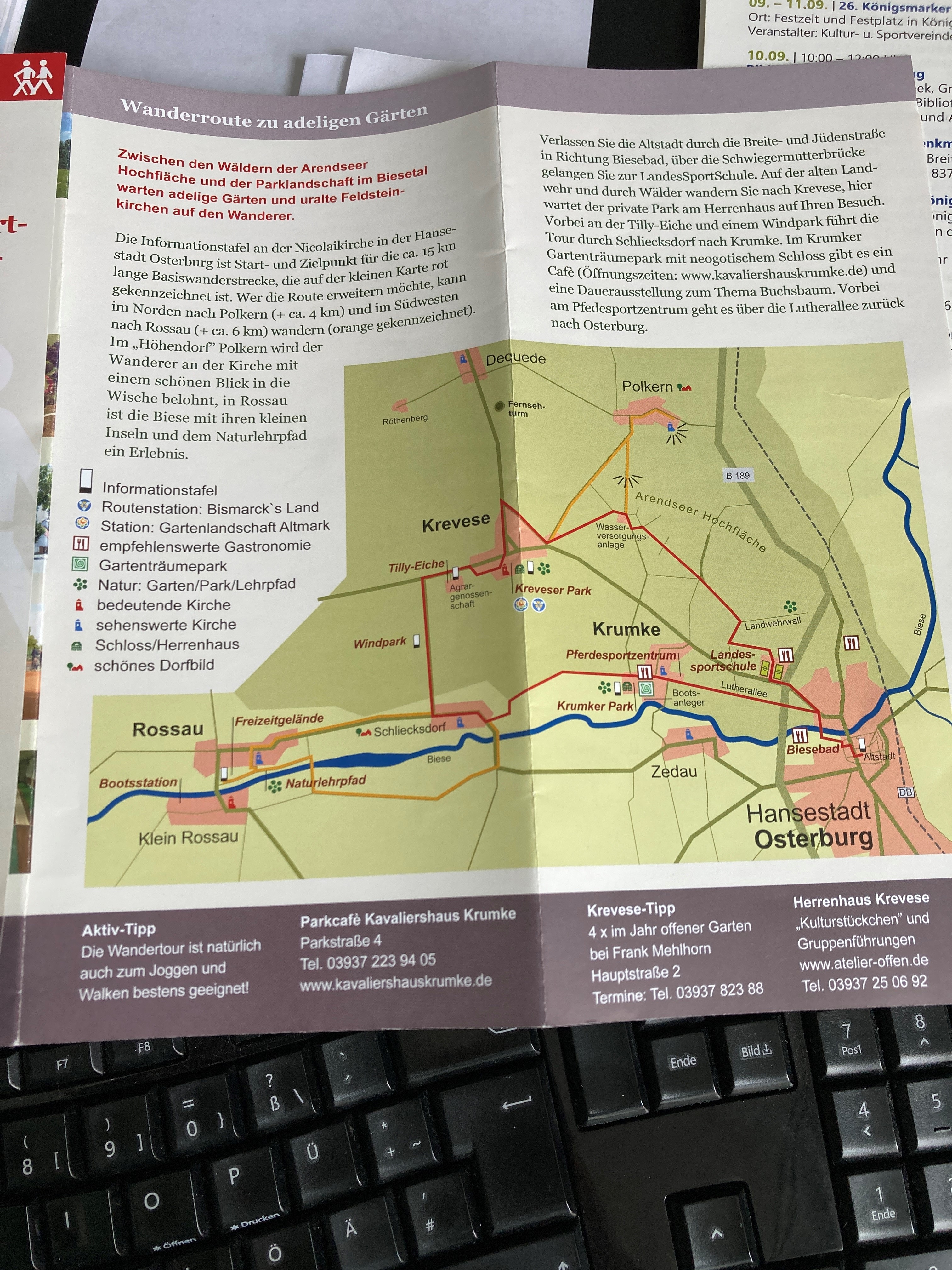 Die 15 Kilometer lange Basiswanderroute ist abgebildet im Flyer "Aktiv-, Sport- und Wellnessangebote". Start an Nicolaikirche Osterburg | Jüdenstraße Richtung Biesebad | über die Schwiegermutterbrücke zur Landessportschule | über den Landwehrwall und durch Wälder nach Krevese | vorbei an der Tilly-Eiche durch Schliecksdorf nach Krumke | weiter Richtung Pferdesportzentrum und über die Lutherallee zurück nach Osterburg.