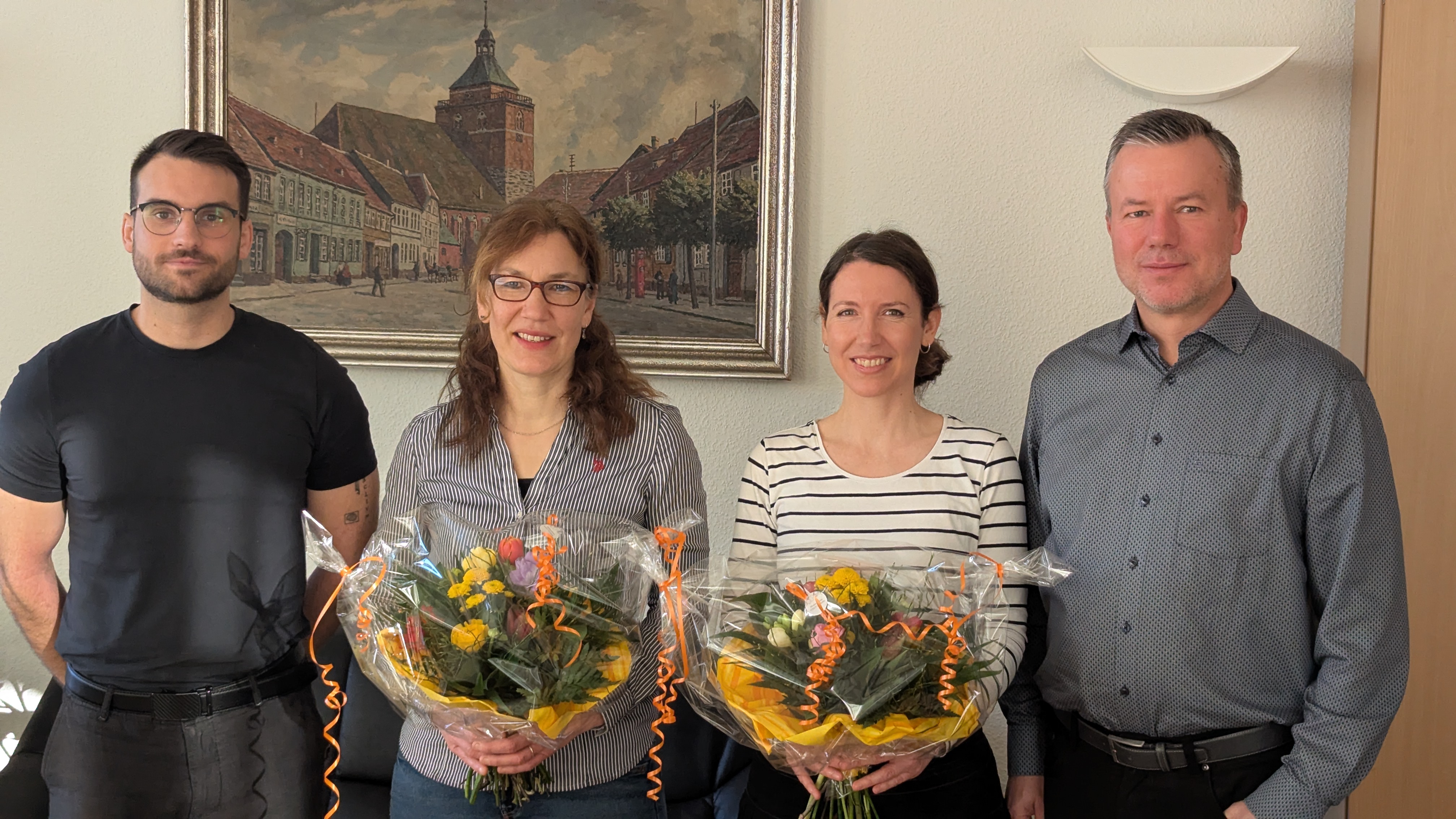 Nach 17 Jahren wechselt die Führungsspitze der Stadt- und Kreisbibliothek "Walter Baumgart" in Osterburg. Anette Rieger (2. v. r.) fokussiert sich auf eigenen Wunsch wieder stärker auf die Abteilung Kinder und Jugend. Die ehemalige Redakteurin der Volksstimme, Astrid Mathis, übernimmt die Leitungsfunktion der Bildungsstätte am Großen Markt 10 und u. a. die damit verbundenen administrativen Aufgaben. Bürgermeister Nico Schulz (r.) gratulierte im Beisein von Hauptamtsleiter Chris Köhn und freut sich auf eine gute Zusammenarbeit.