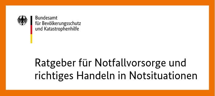 Starkregen, Unwetter, Stromausfall, Brände... Notsituationen wie diese gehören zum Leben. Wie können Sie sich darauf vorbereiten? Wie können Sie sich schützen? Der Ratgeber für Notfallvorsorge und richtiges Handlen in Notsituationen vom Bundesamt für Bevölkerungsschutz und Katastrophenhilfe (BBK) enthält umfangreiche Informationen und Verhaltensempfehlungen zu verschiedensten Situationen. In der Broschüre finden Sie außerdem etliche Checklisten.