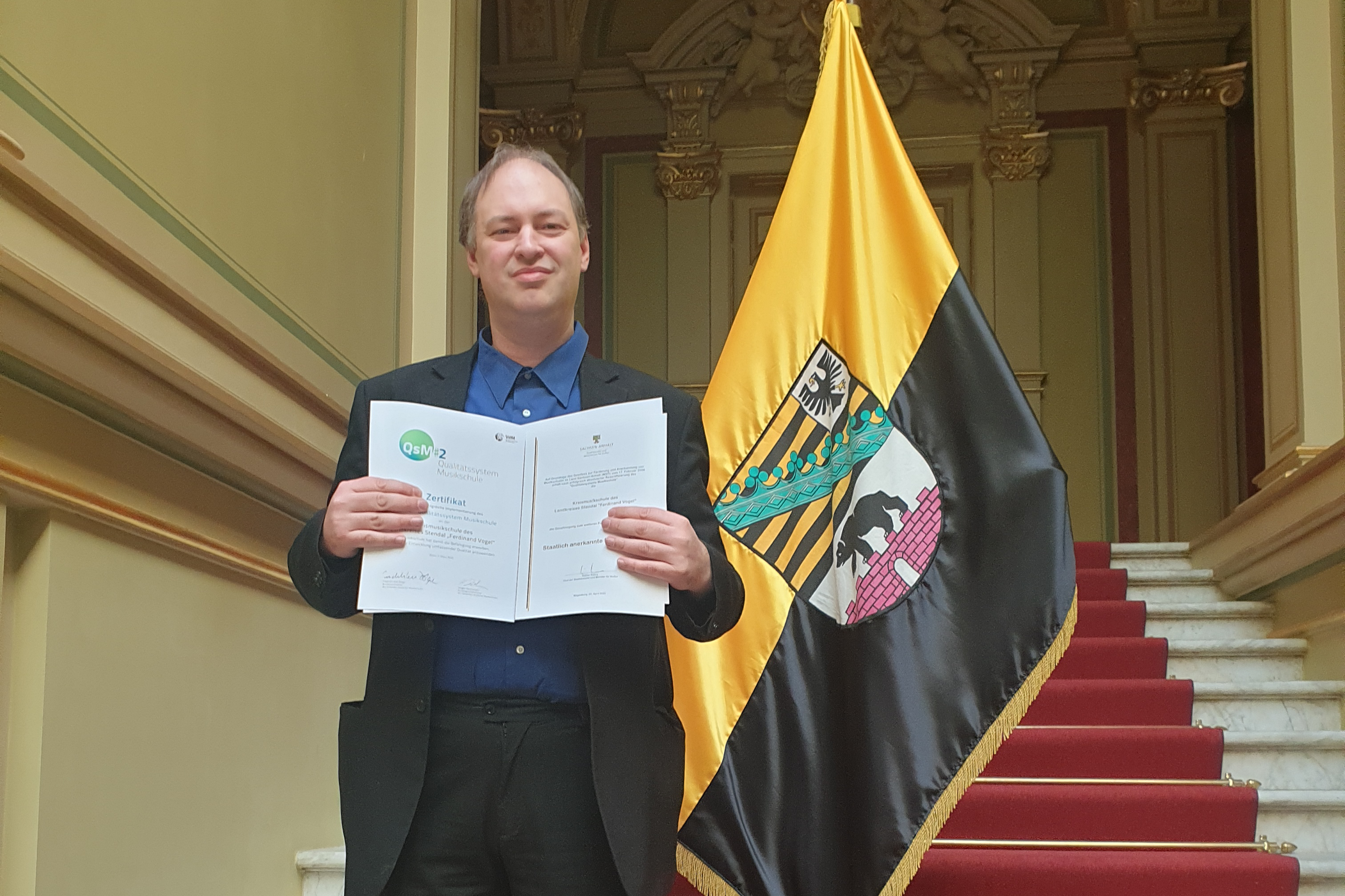 Die Kreismusikschule "Ferdinand Vogel" des Landkreises Stendal bleibt auch in Zukunft staatlich anerkannt. Damit behält sie auch die finanzielle Förderung durch das Land Sachsen-Anhalt. Beinahe ein Jahr lang hat sich die Einrichtung um Leiter Julian Gorus einem Rezertifizierungsverfahren gestellt. Insgesamt wurden fünf Workshops durchgeführt. In der Magdeburger Staatskanzlei hat Gorus Anfang April das Zertifikat aus den Händen von Staatssekretär Sebastian Putz entgegengenommen. „Wir freuen uns natürlich und sind froh, dass wir die Zertifizierung erreicht haben“, sagt Patrick Puhlmann. „Nur dank der finanziellen Förderung des Landes können wir dieses musische Bildungsangebot für die Schüler überhaupt aufrechterhalten. Mein Dank gilt daher allen Lehrkräften um Julian Gorus, welche unsere Kreismusikschule mit Leben füllen“, so der Stendaler Landrat weiter.