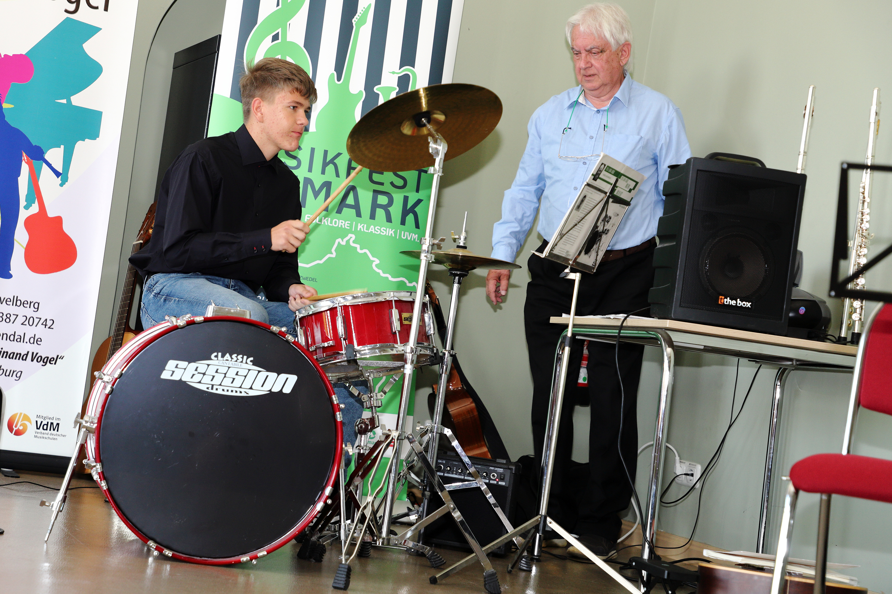 Auf dem Schlagzeug zeigte Adrian Benecke aus Rossau sein Können. Von Michael Glaudi gab er „Hick Hack Polka“ zum Besten. Ihm folgte die 13-jährige Shany-Gia-Lauri Krüger, die wohl die kürzeste Anreise aller Künstler hatte. Die Osterburgerin ist bereits im Jahr 2020 in die studienvorbereitende Ausbildung aufgenommen worden und entzückte das Publikum mit „Prelude“ von Marc-Antoine Charpentier auf ihrer Violine.