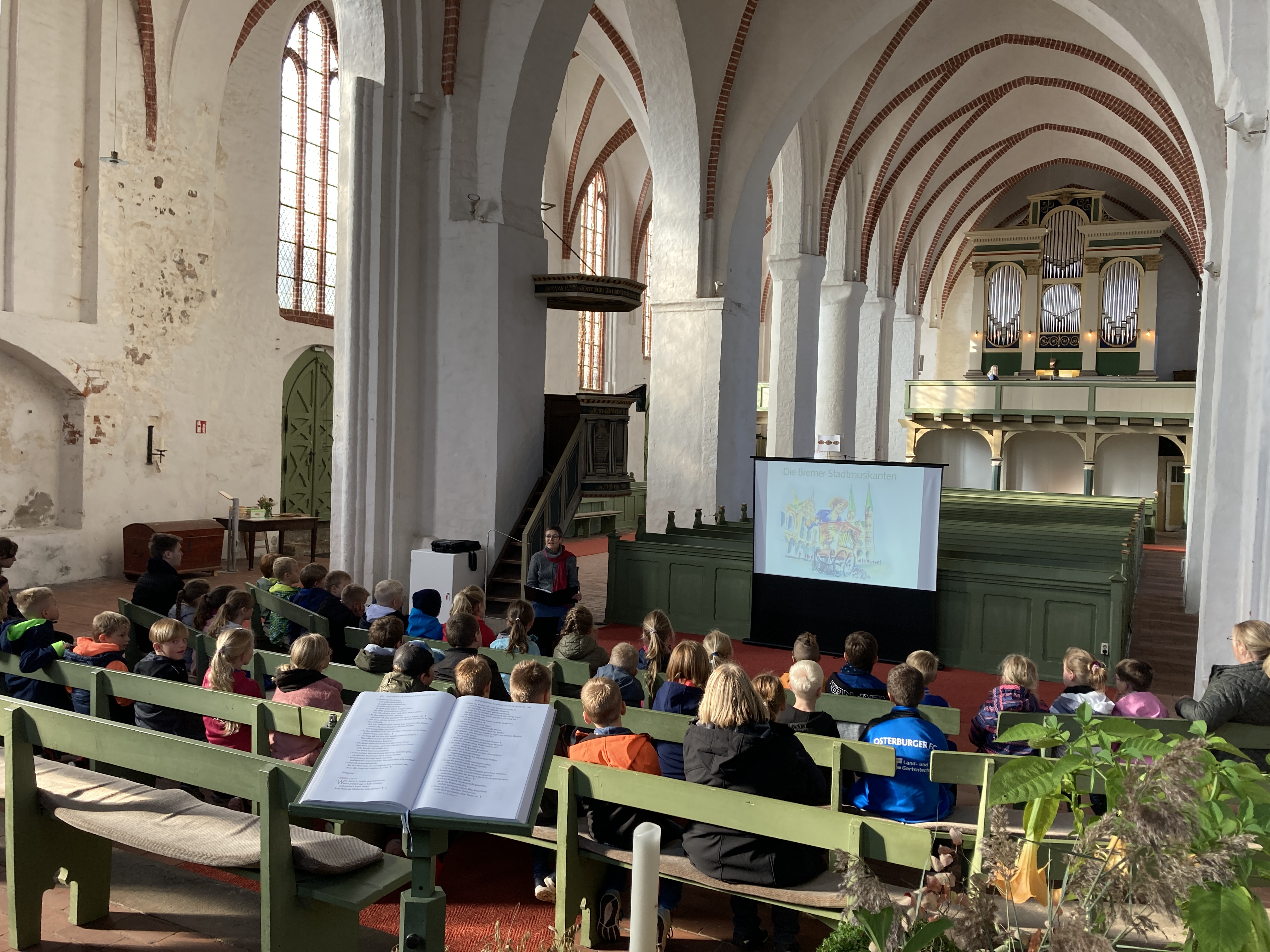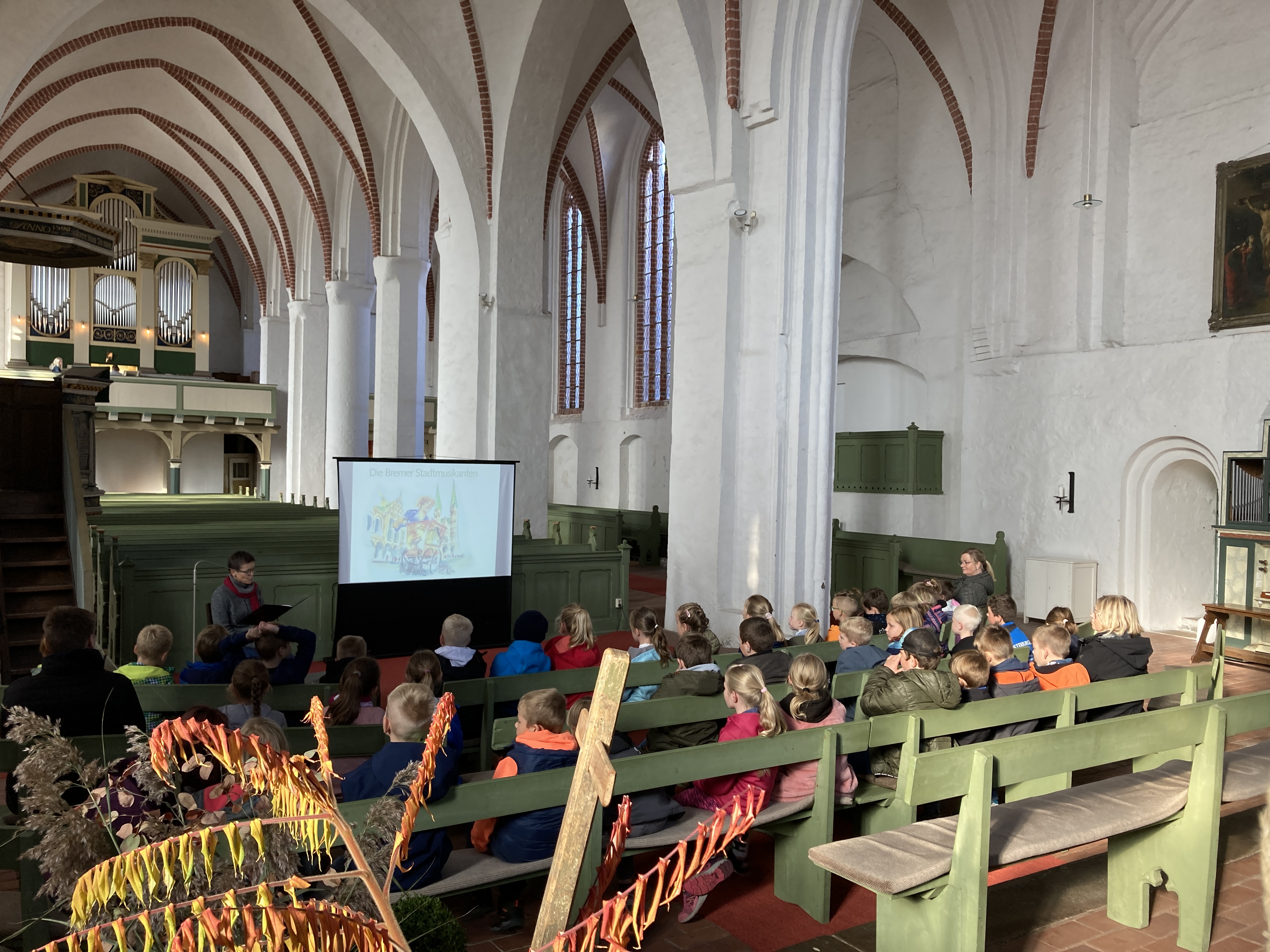 „Oha….“, schubst Finn beim Betreten der evangelischen Kirche St. Nicolai am Montag, den 17. Oktober 2022 seinen Nebenmann leicht an. Der Kopf im Nacken; der Blick Richtung Decke des über 800 Jahre alten Gemäuers. „Bestimmt 100 Meter hoch. Quatsch 1000.“, mutmaßen die beiden Zweitklässler an der Grundschule „Am Hain“ und nehmen vor dem Altar Platz – gemeinsam mit rund 40 weiteren Jungen und Mädchen, die am Vormittag dem Orgelmärchen „Die Bremer Stadtmusikanten“ lauschen wollen. Wie anderthalb Stunden zuvor schon die Erstklässer.