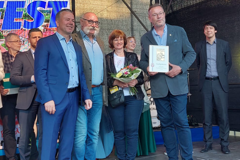 Ausgezeichnet wurde auch das Familienunternehmen „Druckerei Th. Schulz“ mit der goldenen Stadtplakette. Gegründet von Buchbindermeister Franz Theodor Schulz ist es seit 1881 am Markt und überstand all jene Schwierigkeiten, die auch die Geehrten zuvor meisterten. Wenn auch in einer anderen Branche. Eine, die nicht weniger ständigem Wandel unterlag „und unterliegt“, betonte Laudator Klaus-Peter Gose. „Für mich ist das etwas ganz Besonderes heute, denn Thorsten und Susanne gehören zu meinen längsten und besten Freunden. Ihre Unternehmensgeschichte, ihre Leidenschaft für den Berufsstand und die Stadtentwicklung vorzutragen – ist mir eine große Ehre.“ Von der ersten Ausgabe der Lokalzeitung „Osterburger Kreisblatt“ am 1. Januar 1881 bis zur Weiterführung und Erweiterung durch Büro- und Schreibwaren im Sortiment oder den Versandhandel mit Postfiliale durch Thorsten und Susanne seit 1985 in vierter Generation skizzierte der Osterburger Ortsbürgermeister einen oft auch steinigen Weg. „Nach der Wende 1990 galt es neue Herausforderungen zu bestehen“, was durch viele Komponenten gelungen sei; nicht zuletzt durch die Produktion und den Vertrieb der Mitteilungs- und Amtsblätter für die Hansestädte Seehausen und Osterburg. Das Publikum auf dem gefüllten Großen Markt bekräftigte dies mit viel Beifall.