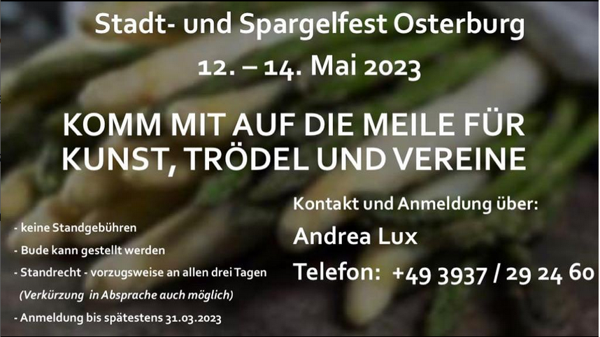 Der Mai scheint noch in weiter Ferne, doch drei Monate sind für die Ausrichter des Stadt- und Spargelfestes in Osterburg genau richtig, um für den Feinschliff des Programms rund um das große Frühlingsfest in der Altmark zu sorgen. Vom 12. bis zum 14. Mai 2023 wird aus der Innenstadt wieder eine Feiermeile mit Radio Brocken Show-Bühne auf dem Großen Markt. Dazu ein bunter Mix aus Schaustellermarkt mit vielen Fahr- und Spielgeschäften sowie umfangreichen Speise- und Getränkeangeboten auf dem Parkplatz Lindenstraße, Kleinen Markt und August-Hilliges-Platz mit einer weiteren Bühne. Sie sind Musiker:in, Unterhaltungskünstler:in oder spielen in einer Band und möchten dabei sein? Melden Sie sich gerne beim Programmverantwortlichen Guido Lenzner per E-Mail an guidolenzner@gmail.com mit ein paar Angaben zum Repertoire und Genre.
