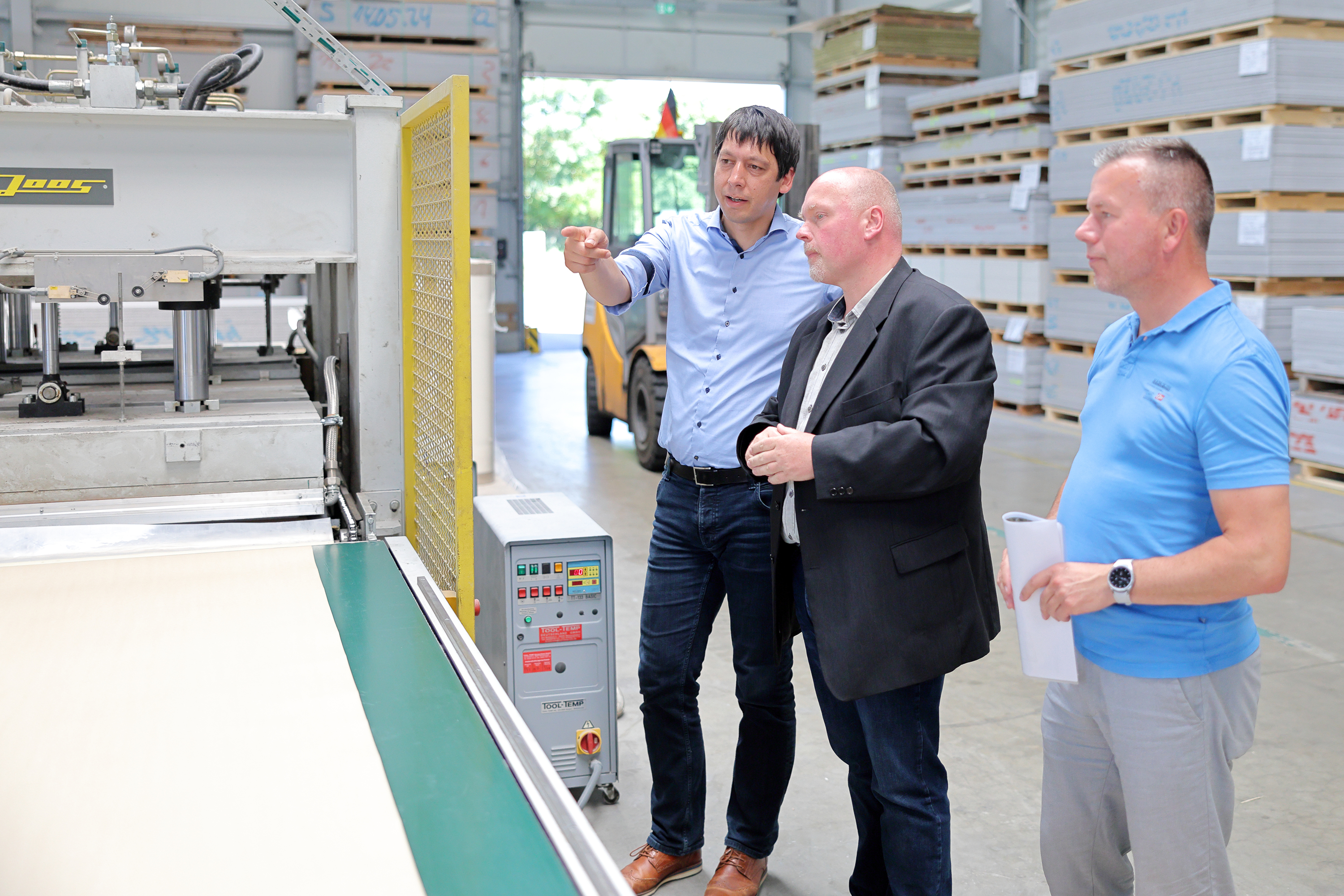 In einem Rundgang durch die großflächigen Produktionshallen stellte Jörg Magdeburg Landrat und Bürgermeister einmal die Prozesse von der Anlieferung der Rohstoffe bis hin zur Auslieferung der fertigen Produkte vor. Dabei wurde sich auch über die Chancen und Risiken der Intel-Ansiedlung bei Magdeburg ausgetauscht. "Aus meiner Sicht bietet diese gute Möglichkeiten für die Altmark und speziell den Landkreis Stendal, sich als Industrie weiterzuentwickeln", sagte Patrick Puhlmann. "Nicht sofort, aber nachhaltig betrachtet ist der Zuzug weiterer Unternehmen gut für unseren Mittelstand", schätzte Ulf Kaspar ein. Hoffnungen hat natürlich auch Nico Schulz auf Neuansiedlungen in seiner Hansestadt und stellte die Planung eines neuen Industriegebiets in direkter Nähe zur künftigen Autobahn 14-Abfahrt Osterburg vor. "Wir planen aber auch gerade ein Neubaugebiet für Einfamilienhäuser", so das Stadtoberhaupt.