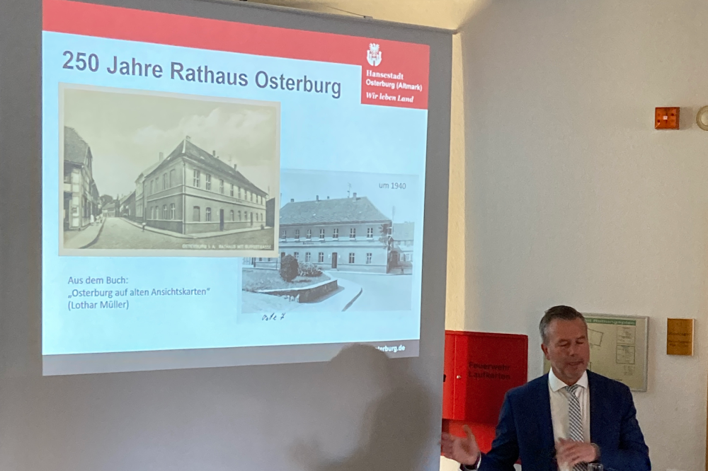 Rund 75 Gäste nahmen die Einladung von Osterburgs Bürgermeister Nico Schulz zum historischen Stadtgeburtstag am frühen Abend des 5. Oktober 2022 an. Treffpunkt: Rathaus-Foyer. Im ersten Moment vielleicht etwas ungewöhnlich, doch bewusst so gewählt – handelte es sich doch um den 250. Geburtstag dieses Gebäudes. „Richtig gemütlich“, „schönes Ambiente, wer hätte das gedacht“, waren sich die Besucher einig und lauschten den kurzweiligen und amüsanten Vorträgen des Rathauschefs und des Museumsleiters. Der erste Öffentliche dieser Art von Florian Fischer wohlgemerkt. Der gebürtige Wülfrather (bei Wuppertal) ist seit dem 7. März 2022 Leiter des Kreismuseums an der Breiten Straße und inzwischen bestens vertraut mit seiner Wirkungsstätte, sorgte mit seinen geschichtlichen Anekdoten zur Besetzung Osterburgs durch die Schweden für etliche Lacher im Raum. Die Schlimmsten seien sie gewesen, die Nordmänner. 40 Tonnen Gold in Reichstalern, so heißt es, wären im 30-jährigen Krieg an sie geflossen – umgerechnet 214 Millionen Euro. Geld, das man beim Rathausumbau oder -anbau heutzutage ganz gut gebrauchen könnte – eine Nachfrage lohne sich gegebenenfalls, nahm er Nico Schulz' zuvor gesponnen Faden mit Humor auf. Denn ja, die Geschichte des Rathauses, besser gesagt die Pläne in der Nachwendezeit dazu „sind zu einer unendlichen Geschichte geworden.“ Mit angeregten Gesprächen in lockerer Atmosphäre ging ein unterhaltsamer Abend zu Ende. Und nahm gleichzeitig einen neuen Anfang. Die Gründung eines Vereins „Freunde und Förderer des Kreismuseums Osterburg“. Interessenten wenden sich an das Vorzimmer des Bürgermeisters unter 03937-492701, der den Vorsitz übernimmt, oder an das Museum unter 03937-83730. Später dazu mehr...