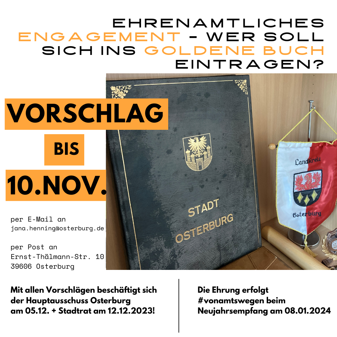 Im Rahmen des Neujahrsempfangs der Hansestadt Osterburg (Altmark) am Montag, den 8. Januar 2024 wird eine Person für ihr herausragendes ehrenamtliches Engagement mit einem Eintrag ins Goldene Buch sowie 500 Euro Geldprämie geehrt.